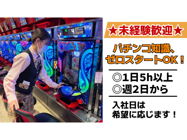 \冬のアルバイトデビュー歓迎!/現在、ホールやカウンターをお任せする店舗スタッフを募集しています。最初は簡単な業務からスタートしますのでパチンコ経験がない方、業界未経験の方もご安心ください!重い玉運びゼロ!残業ほぼなしで体の負担も少なめです。入社日は希望に応じます。まずはお気軽にお問合せください!