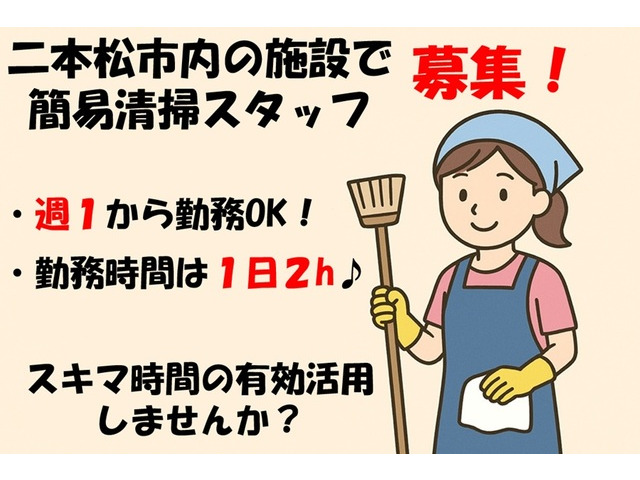 短時間のお仕事をしてみませんか?難しいお仕事はなく、店内清掃です。未経験の方でも出来るお仕事となり、Wワークの方でも働きやすい時間です!