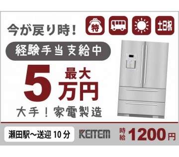 【20代,30代活躍中】【冷蔵庫部品取り付け・目視チェック】20~50代活躍中/経験者限定/最大5万円の特別手当あり/土日祝休み/送迎バス有/日払い可/月収16.7万円