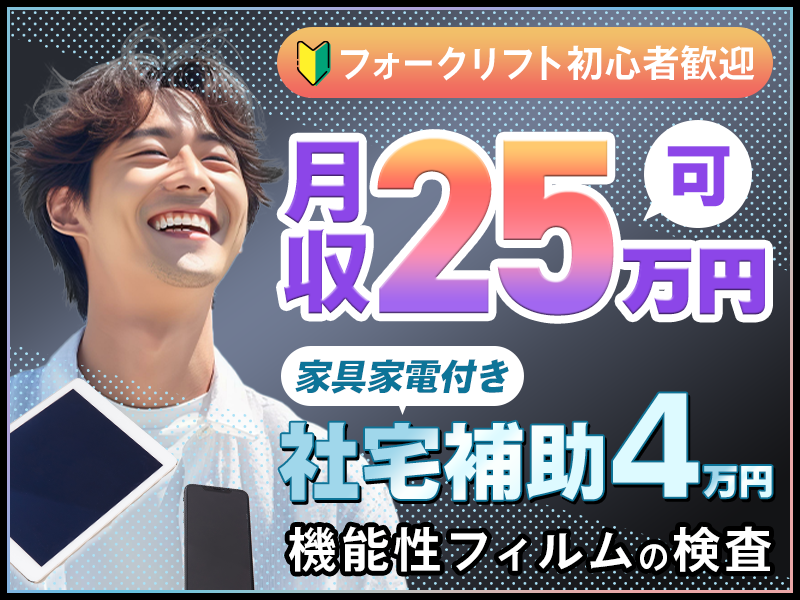 ★毎週ミニボーナス★【社宅補助4万円☆家具家電付き】月収25万可+皆勤手当て/半分は座り仕事◆機能性フィルムの検査/フォークリフト初心者さん大歓迎♪【履歴書不要☆オンライン面接OK】【入社キャンペーン