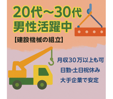 【20代,30代活躍中】20代~30代男性活躍中!【建設機械の組立】月収30万円以上も可!!/日勤&土日祝休み♪