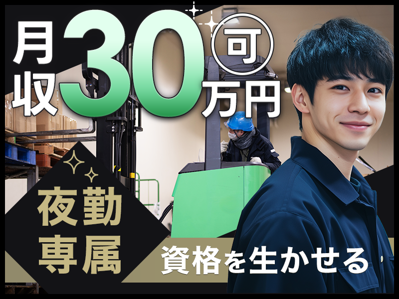 【20代,30代活躍中】【夜勤専属】月収30万円可☆倉庫でのリーチフォークリフト・入出庫作業♪資格を生かせる☆20~50代の男女活躍中