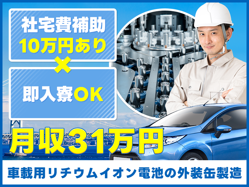 <南あわじ市>【社宅費補助あり×即入寮OK】月収31万円可☆車載用電池の外装缶の機械オペレーターや検査!【履歴書不要☆オンライン面接OK】【入社キャンペーン実施中!】