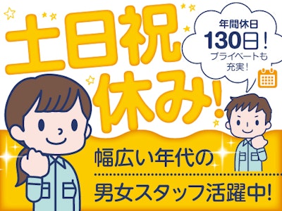 【1】製造スタッフ/1、350円~【2】物流スタッフ/1、250円~(リフトなし)【3】フォークリフトスタッフ/1、350円~ ◎共通→土日祝休み*年間休日130日以上*安心教育制度あり(未経験スタートOK!)