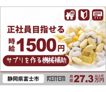 【サプリ機械補助】寮費無料/正社員目指せる/時給1500円/冷暖房完備/月収27.3万円