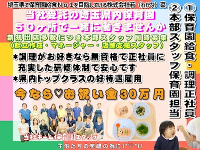 埼玉県さいたま市北区別所町122-1[1][2]A.南浦和文蔵はばたき保育園(埼玉県さいたま市南区文蔵3-38-6)B.南浦和おおぞら保育園(埼玉県さいたま市南区南浦和2-10-11)C.ルアナ保育園土呂(埼玉県さいたま市北区土呂町1-9-1)D.ニチイキッズ 上戸田保育園(埼玉県戸田市上戸田2-38-10)[3]株式会社若菜:本社(埼玉県さいたま市北区別所町122-1)[4]本社または埼玉県内の各保育園株式会社若菜:本社(埼玉県さいたま市北区別所町122-1)※直行直帰有り、車通勤可株式会社若菜 埼玉県内保育園(Z02)