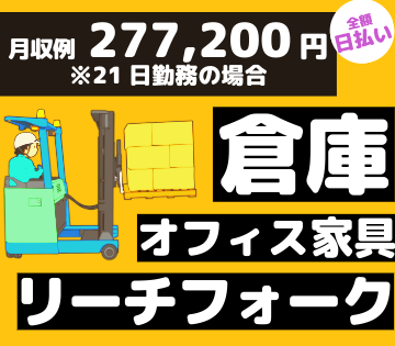 シフト勤務で月収例29万以上目指せる♪【オフィス家具倉庫でフォークリフト作業】日払いOK/「潮見駅」から徒歩圏内◎