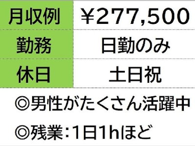 時給1400円~時給1400円月収26.2万円以上可※内訳/時給1400円×7時間45分×21日+残業手当※繁忙期・閑散期等によって月収・残業時間は変動します◆日払い・仮払いOK(アプリでカンタン申請!)※こちらの求人は日払いの求人です【交通費】交通費支給あり支給(規定あり)