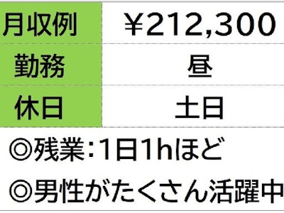 月給23万1800円〜月給 231、800円~312、800円【モデル収入例】◆入社3年目・独身月収:338、000円年収:5、026、000円◆入社6年目・既婚(子ども2人)月収:445、000円年収:6、310、000円※50時間の残業手当、諸手当含む※あくまでも例のため実際と異なる場合あり