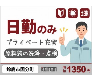 【原料袋の洗浄・点検】夕方5時半に退勤/残業0/土日祝休み/未経験OK/月収21.2万円