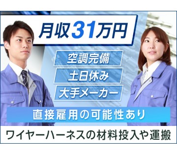 <鈴鹿市>【月収31万円可×慰労金10万円支給♪】土日休み☆大手メーカーでワイヤーハーネスの材料投入や運搬!直接雇用の可能性あり◎【履歴書不要☆オンライン面接OK】【入社キャンペーン実施中!】