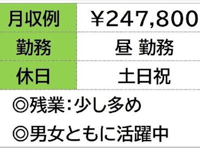 時給 1,300円以上【給与】時給 1300 円☆月収例 221,000円♪ 【所定157.5h×1300円+残業10h×1625円】 ※試用期間は2週間(時給の変動なし)☆給与前払制度あり♪ お電話いただければ即振込み可能!毎週OK! お気軽にお使えいただけます。【交通費】☆電車通勤の場合、通勤定期代(上限1万円まで)応援制度あります。☆通勤スクーター貸出(月3500円)あります。←これ、人気あります♪☆通勤自転車無料貸出あります。◆派遣が初めての方や、遠方からも安心してご応募ください!◆夜間の面接や、お友達同士でのご応募もお気軽にご相談ください。