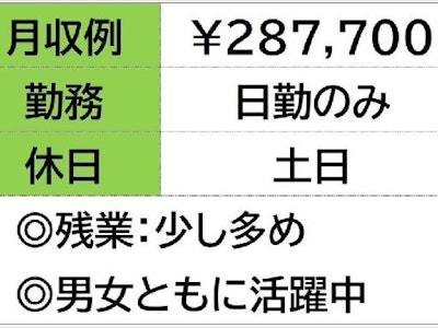 月給26.5万円月給 :265,000円~月収例:309,150円(月給+各種手当)※法定外残業手当 44,150 円/月※賞与:450,000 円/年(見込み額)※年収:4,159,800 円/年(想定年収)※月給はスキル・経験により考慮します(~285,000円)※昇給あり(年1回)※研修中(3週間)は月給210,000円/月、社宅利用の場合、社宅費全額補助支払い方法: 日払い制度あり