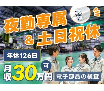 ★祝金総額7万円★\力仕事ほぼナシ♪/◆夜勤専属◆未経験OK!月収30万円可!土日祝休みで年休126日あり◎空調完備◎モーターなど電子部品の組立て・検査!【履歴書不要☆オンライン面接OK】【入社キャン