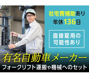 ★毎週ミニボーナス★社宅費補助あり!有名自動車メーカーGでフォークリフト運搬や機械へのセット♪年休136日!直接雇用の可能性あり◎【履歴書不要☆オンライン面接OK】【入社キャンペーン実施中!】