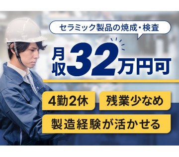 20~40代活躍中★【月収32万円可】4勤2休☆経験が活かせる◎セラミック製品の焼成・検査作業!残業少なめ☆