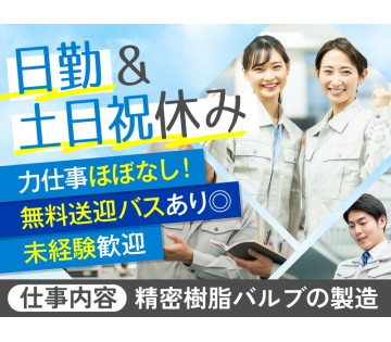 20~40代活躍中★ 【日勤&土日祝休み☆】精密樹脂バルブの製造☆力仕事ほぼなし!未経験歓迎☆無料送迎バスあり◎