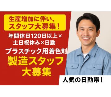 【20代,30代活躍中】・生産増加に伴い、スタッフ大募集! \年間休日120日以上×土日祝休み×日勤/ プラスチック用着色剤の製造スタッフ大募集 ・20代~40代までの男性活躍中!