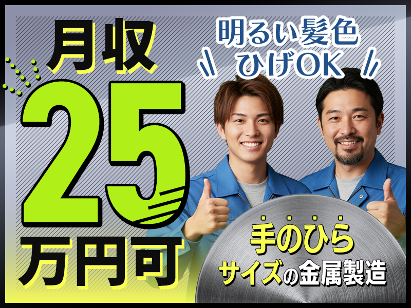 【20代,30代活躍中】★毎週ミニボーナス★【高収入☆月収25万円可!】工場勤務の経験が活かせる♪手のひらサイズの金属製造!車・バイク通勤OK★明るい髪色・ひげOK◎【履歴書不要☆オンライン面接OK】