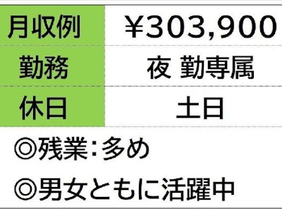 ☆月収例 303,900円♪〈所定168h×1200円+残業43h×1500円+深夜126h×300円〉