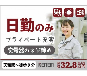 【変電器のネジ締め】実質時給1750円/日勤シフト専属/土日祝休み/残業少なめ/月収32.8万円