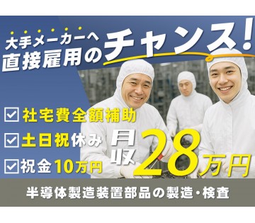 <中津市>【入社祝金10万円】月収28万円可&土日祝休み☆大手メーカーGで半導体製造装置部品の製造・検査◎更新手当あり!【社宅費全額補助】【履歴書不要☆オンライン面接OK】【入社キャンペーン実施中!】