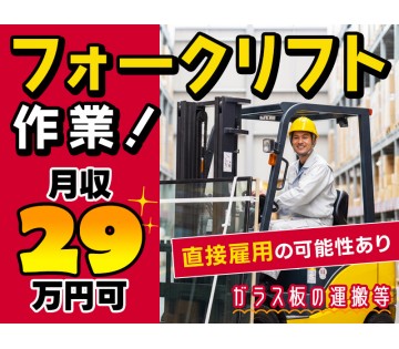 【フォークリフト作業】ガラス板の検査・運搬!月収29万円可☆直接雇用の可能性あり!最寄駅から徒歩圏内【履歴書不要☆オンライン面接OK】【入社キャンペーン実施中!】