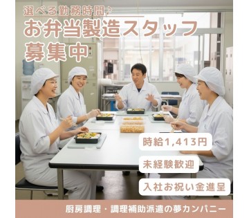 3つの勤務時間帯から選べる!週4日~OK【お弁当製造スタッフ】未経験歓迎◎おいしい食事つき★