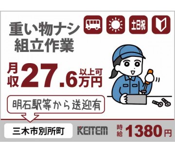 【部品の組立・ピッキング】20~50代半ばが活躍中/重い物なし/コツコツとネジ締めなど/日勤/土日祝休み/無料送迎あり/冷暖房完備/月収27.6万円