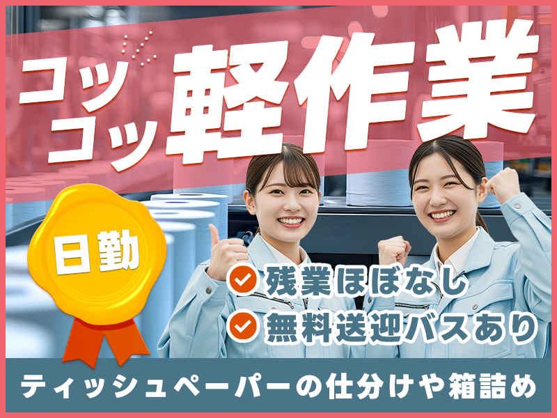 【日勤&残業ほぼなし】コツコツ軽作業☆ティッシュペーパーの仕分けや箱詰め♪無料送迎バスあり◎