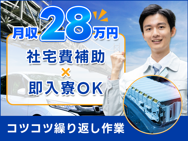 <南あわじ市>【月収28万円可】社宅費補助あり×即入寮OK☆コツコツ作業◎車載用リチウムイオン電池の機械オペレーター・検査!【履歴書不要☆オンライン面接OK】【入社キャンペーン実施中!】