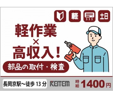 【20代,30代活躍中】未経験OK 【部品の取り付け】 20~30代活躍中/空調完備の職場でチームワーク/長岡京駅から徒歩13分/土日休み/時給1400円