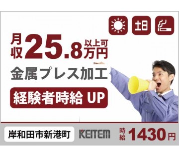 日勤のみ 【金属の加工検査】 20~40代活躍中/プレス加工未経験OKの時給1430円/土日休みの残業少なめ/車・バイク通勤OK/月収25.8万円以上可