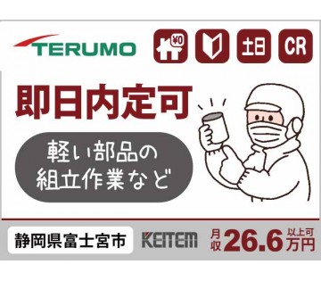静岡県富士宮市【住所】静岡県富士宮市三園平818 テルモ㈱富士宮工場(請負先)テルモヒューマンクリエイト株式会社最寄り駅:富士宮駅アクセス:富士宮駅 自動車7分