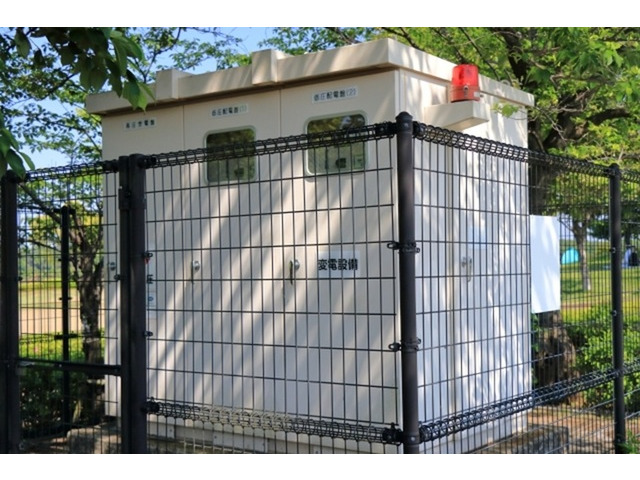 発電所から送られてくる高電圧の電気を、施設で使える電圧までに変換する機器です。