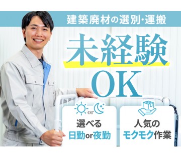 【未経験OK】人気のモクモク作業☆建築廃材の選別・運搬◎基本残業ナシ♪選べる日勤or夜勤♪直接雇用のチャンスあり