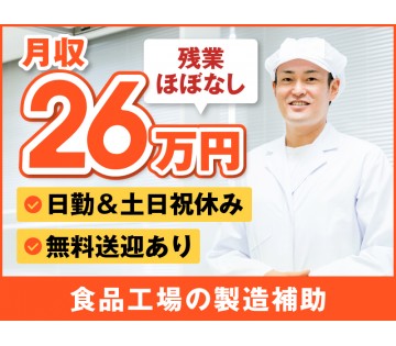 <横浜市鶴見区>【月収26万円可★】食品工場のモクモク製造補助!日勤&土日祝休み☆残業ほぼなし!【履歴書不要☆オンライン面接OK】【入社キャンペーン実施中!】
