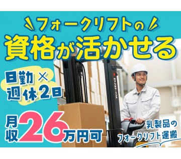 【フォークリフトの資格が活かせる!】月収26万円可☆日勤×週休2日♪乳製品のピッキングやフォークリフト運搬♪