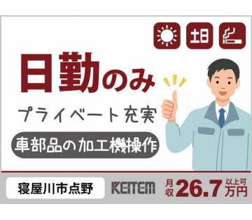 【20代,30代活躍中】金属加工スキルが身く 【車部品の加工操作】 20~30代活躍中/未経験OKの日勤シフト/土日休み/バイク通勤OK/月収26.7万円以上可