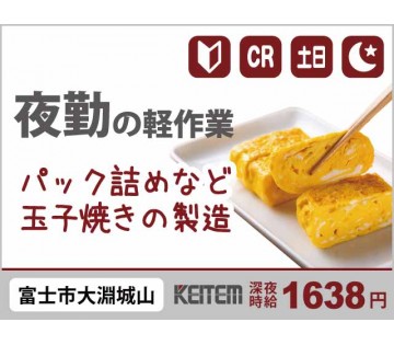 【卵焼きのパック詰め】20~50代半ばが活躍中/夜勤でモクモク軽作業/残業少なめ/経験不問/力仕事なし/空調完備のクリーンルーム/月収28万円